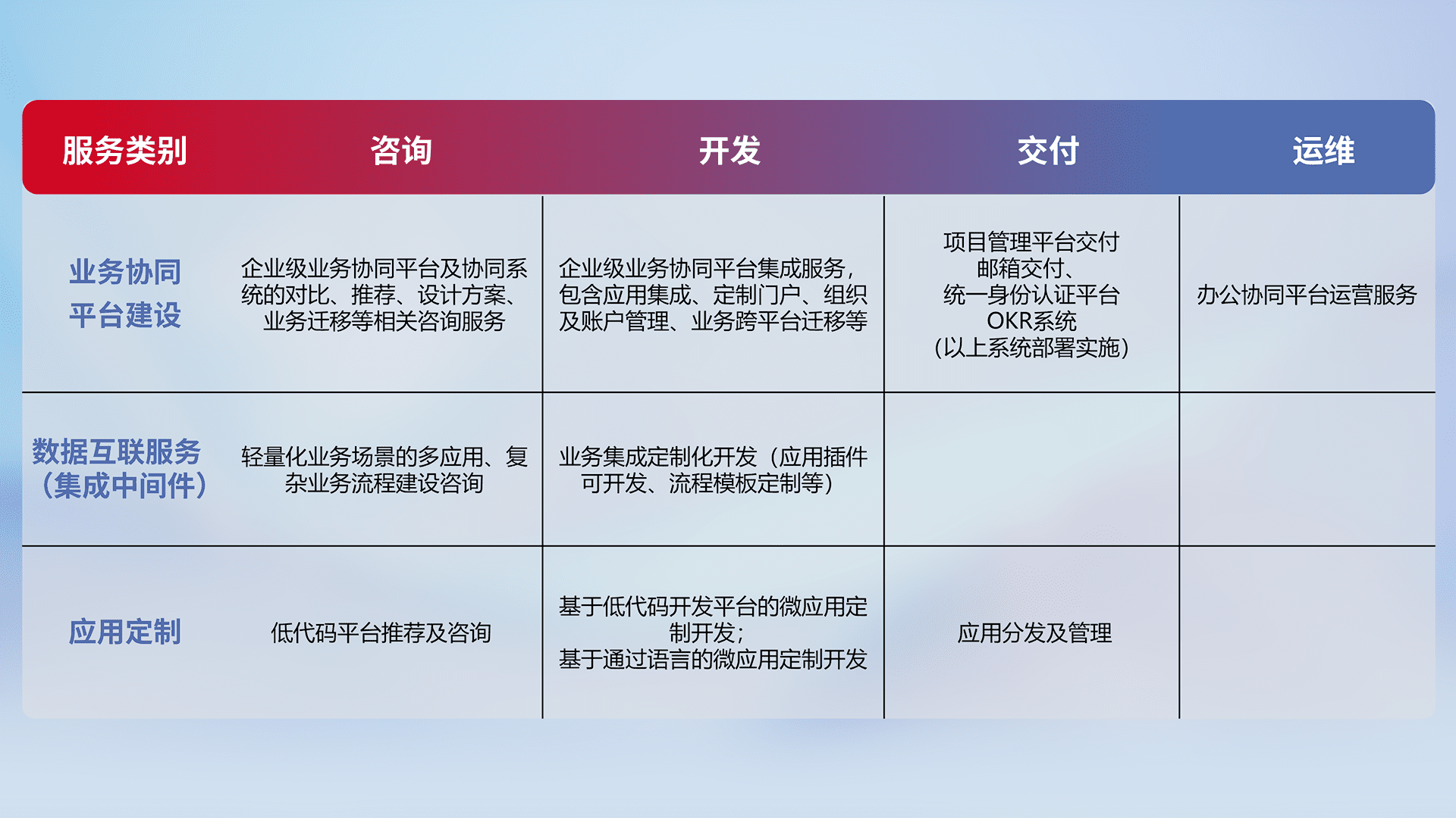 针对钉钉、、企微、、、、IDaas等平台级产品提供产品的规划、、、、方案、、、交付、、、、定制化开发等服务,,,,实现如统一协同办公、、、、智能客户服务、、、混合会议管理、、、、智能数据查询、、、、等业务场景,,,实现数字化转型。。。。