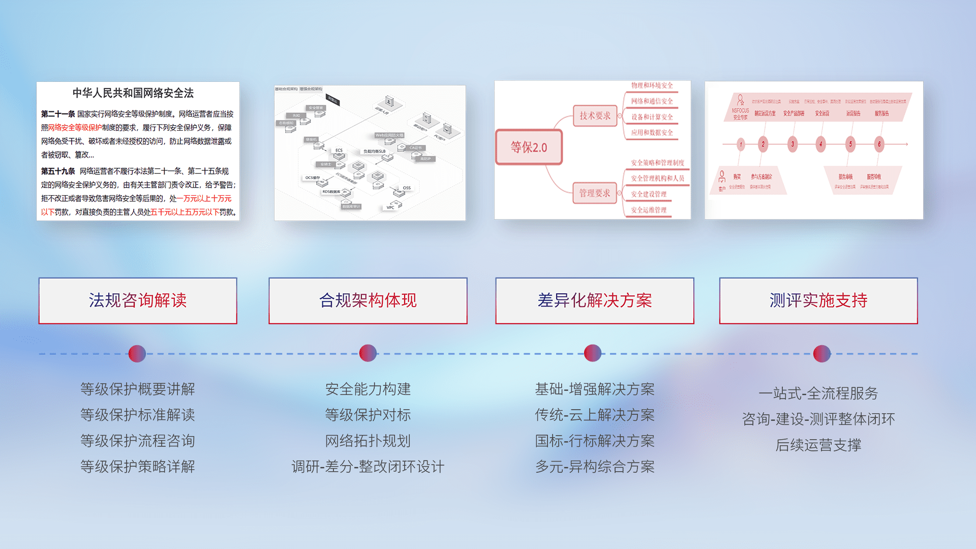 通过专业的法律咨询解读、、、合规架构体现、、、差异化解决方案、、、测试实施支持等服务,,,为客户量身打造等保合规体系。。。
